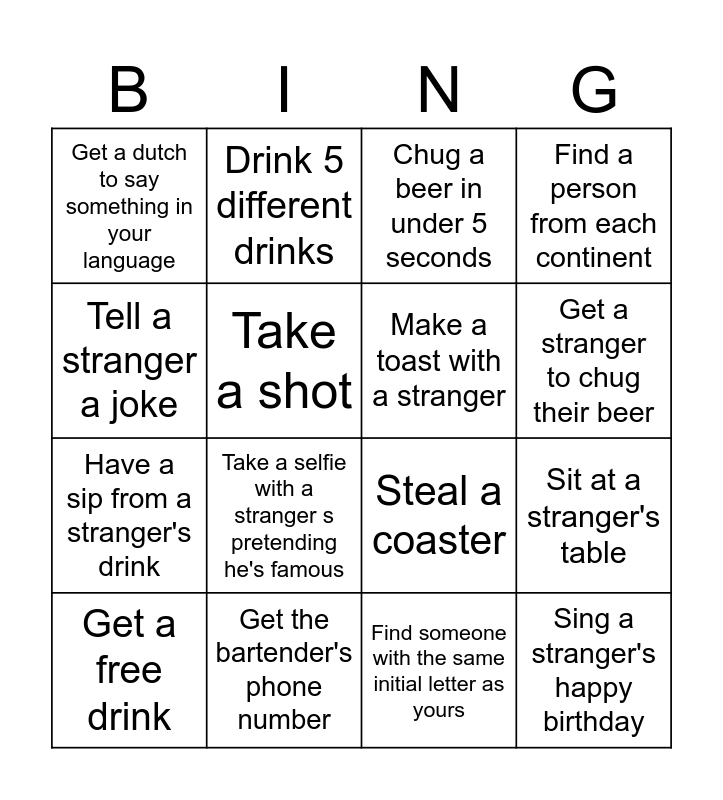 This bingo card has 16 words: Get the bartender's phone number, Sit at a stranger's table, Chug a beer in under 5 seconds, Get a dutch to say something in your language, Have a sip from a stranger's drink, Drink 5 different drinks, Steal a coaster, Find someone with the same initial letter as yours, Tell a stranger a joke, Take a shot, Get a free drink, Find a person from each continent, Take a selfie with a stranger s pretending he's famous, Get a stranger to chug their beer, Make a toast with a stranger and Sing a stranger's happy birthday.