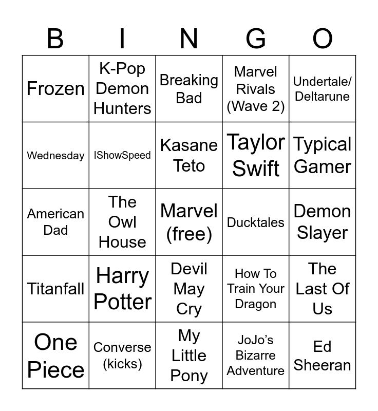 This bingo card has a free space and 24 words: Harry Potter, Converse (kicks), Kasane Teto, One Piece, Undertale/ Deltarune, Frozen, Wednesday, K-Pop Demon Hunters, Ducktales, Devil May Cry, Taylor Swift, American Dad, How To Train Your Dragon, The Last Of Us, IShowSpeed, JoJo’s Bizarre Adventure, Demon Slayer, Breaking Bad, Typical Gamer, The Owl House, Ed Sheeran, Titanfall, Marvel Rivals (Wave 2) and My Little Pony.