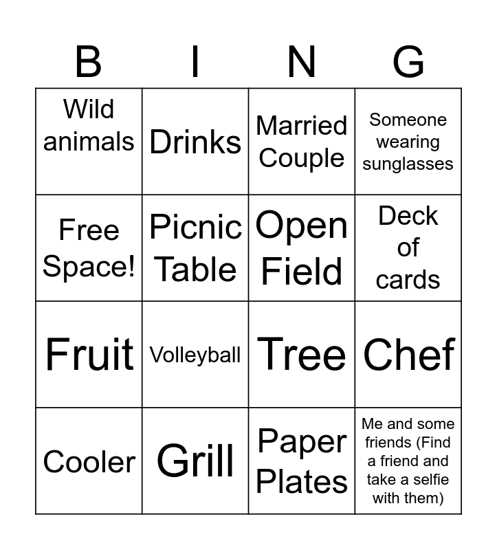 This bingo card has 16 words: Grill, Chef, Married Couple, Wild animals, Fruit, Drinks, Tree, Paper Plates, Free Space!, Picnic Table, Cooler, Someone wearing sunglasses, Volleyball, Deck of cards, Open Field and Me and some friends (Find a friend and take a selfie with them).