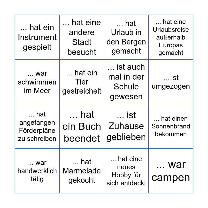 This bingo card has 16 words: ... war handwerklich tätig, ... hat Marmelade gekocht, ... hat Urlaub in den Bergen gemacht, ... hat eine Urlaubsreise außerhalb Europas gemacht, ... war schwimmen im Meer, ... hat eine andere Stadt besucht, ... ist Zuhause geblieben, ... hat einen Sonnenbrand bekommen, ... hat ein Instrument gespielt, ... hat ein Tier gestreichelt, ... hat eine neues Hobby für sich entdeckt, ... ist umgezogen, ... hat angefangen Förderpläne zu schreiben, ... hat ein Buch beendet, ... ist auch mal in der Schule gewesen and ... war campen.