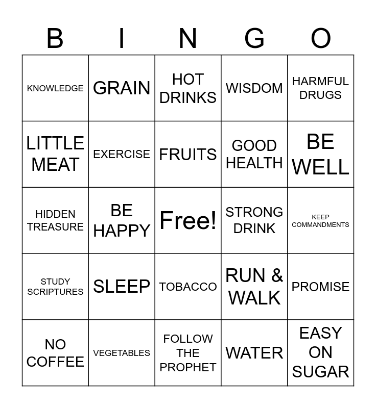 This bingo card has a free space and 24 words: SLEEP, VEGETABLES, FRUITS, NO COFFEE, HARMFUL DRUGS, KNOWLEDGE, LITTLE MEAT, GRAIN, STRONG DRINK, TOBACCO, GOOD HEALTH, HIDDEN TREASURE, RUN & WALK, PROMISE, EXERCISE, WATER, KEEP COMMANDMENTS, HOT DRINKS, BE WELL, BE HAPPY, EASY ON SUGAR, STUDY SCRIPTURES, WISDOM and FOLLOW THE PROPHET.