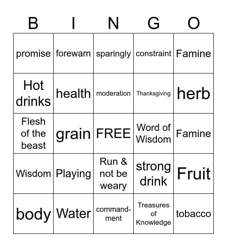 This bingo card has a free space and 24 words: Playing, Water, moderation, body, Famine, promise, Hot drinks, forewarn, Word of Wisdom, Run & not be weary, Thanksgiving, Flesh of the beast, strong drink, Fruit, health, Treasures of Knowledge, Famine, sparingly, herb, grain, tobacco, Wisdom, constraint and command- ment.