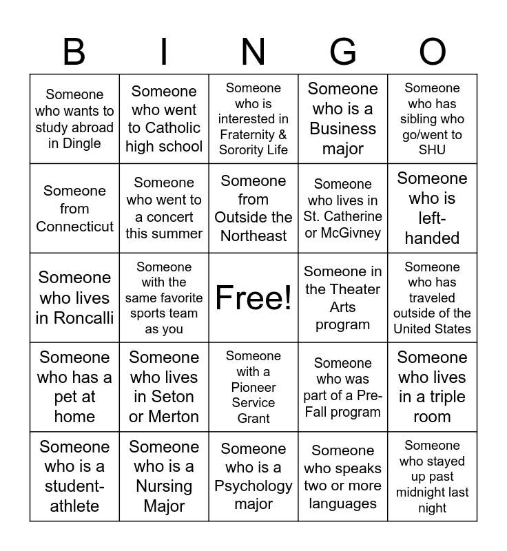 This bingo card has a free space and 24 words: Someone who lives in Seton or Merton, Someone who is a Nursing Major, Someone from Outside the Northeast, Someone who is a student-athlete, Someone who has sibling who go/went to SHU, Someone who wants to study abroad in Dingle, Someone from Connecticut, Someone who went to Catholic high school, Someone in the Theater Arts program, Someone with a Pioneer Service Grant, Someone who lives in St. Catherine or McGivney, Someone who lives in Roncalli, Someone who was part of a Pre-Fall program, Someone who lives in a triple room, Someone who went to a concert this summer, Someone who speaks two or more languages, Someone who has traveled outside of the United States, Someone who is interested in Fraternity & Sorority Life, Someone who is left-handed, Someone with the same favorite sports team as you, Someone who stayed up past midnight last night, Someone who has a pet at home, Someone who is a Business major and Someone who is a Psychology major.