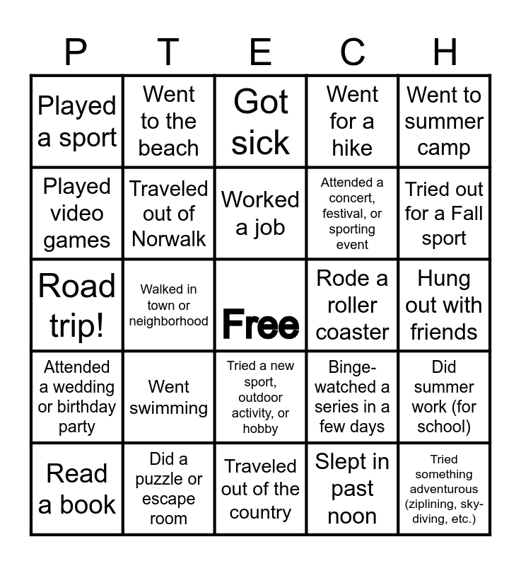 This bingo card has a free space and 24 words: Read a book, Went swimming, Worked a job, Slept in past noon, Went to summer camp, Played a sport, Went to the beach, Got sick, Rode a roller coaster, Hung out with friends, Road trip!, Traveled out of Norwalk, Binge-watched a series in a few days, Did summer work (for school), Played video games, Did a puzzle or escape room, Traveled out of the country, Went for a hike, Tried out for a Fall sport, Attended a wedding or birthday party, Walked in town or neighborhood, Tried a new sport, outdoor activity, or hobby, Attended a concert, festival, or sporting event and Tried something adventurous (ziplining, sky-diving, etc.).