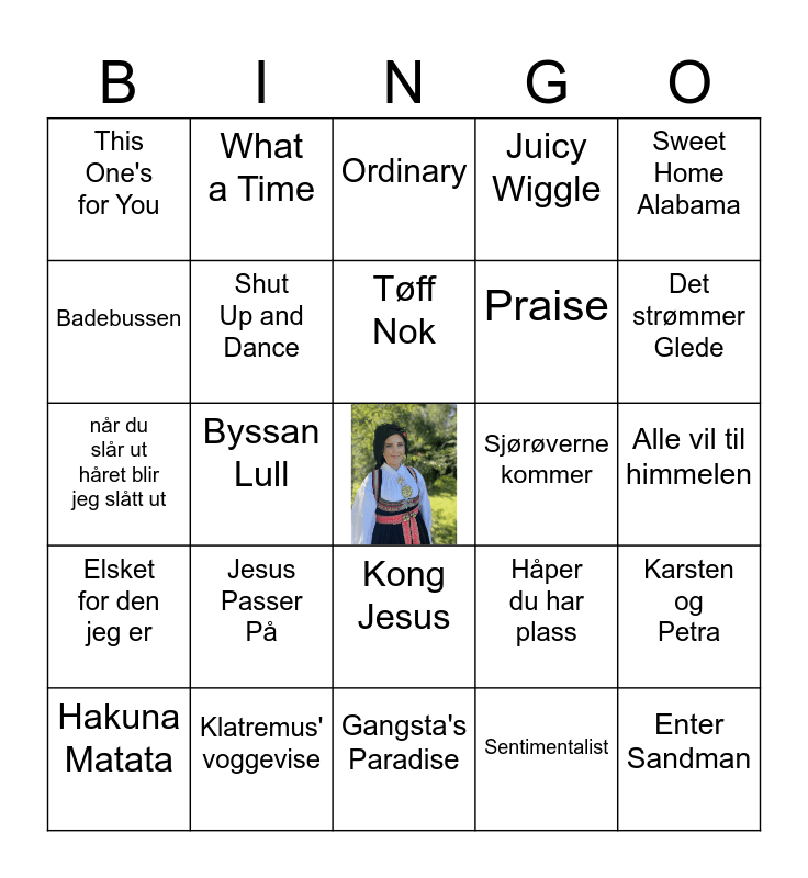 This bingo card has a free space and 44 words: Stone Cold, Enter Sandman, Shimmer and Shine, Hakuna Matata, Church Clap, Sentimentalist, Ordinary, Country Girl (Shake It for Me), Sweet Home Alabama, Klatremus' voggevise, Juicy Wiggle, Sjørøverne kommer, Kong Jesus, Jesus Passer På, Gi meg Jesus, Gangsta's Paradise, In Da Club, når du slår ut håret blir jeg slått ut, Free Fallin', Det strømmer Glede, What a Time, Helium, All Night, This One's for You, Cheap Thrills, Alle vil til himmelen, If Ain't Got You, Waka Waka, Håper du har plass, Elsket for den jeg er, Bæ Bæ Lille Lam, Karsten og Petra, The Lion Sleeps Tonight, Peppa Pig, Byssan Lull, Blåmann, Blåmann, Kjære Gud jeg har det godt, Hvem er Jungelens Konge?, Tøff Nok, Badebussen, Praise, Milkshake, Shut Up and Dance and Lille Måltrost.
