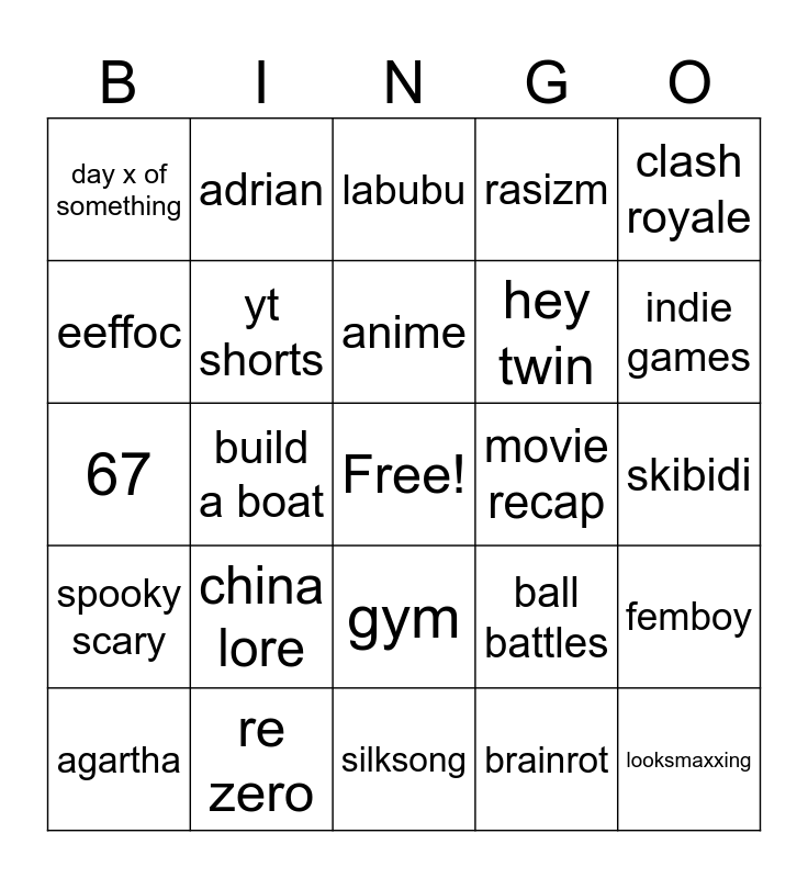 This bingo card has a free space and 24 words: china lore, re zero, anime, agartha, clash royale, day x of something, eeffoc, adrian, movie recap, gym, hey twin, 67, ball battles, femboy, yt shorts, brainrot, skibidi, labubu, indie games, build a boat, looksmaxxing, spooky scary, rasizm and silksong.