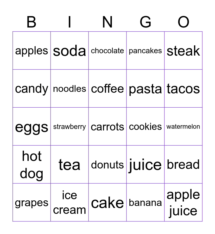 This bingo card has 35 words: rice, lettuce, dumplings, pasta, apple juice, apples, noodles, milk, cookies, water, eggs, soda, donuts, popcorn, steak, hot dog, ice cream, chocolate, banana, watermelon, grapes, strawberry, carrots, pizza, tacos, candy, broccoli, cake, juice, bread, cucumber, tea, coffee, pancakes and bacon.