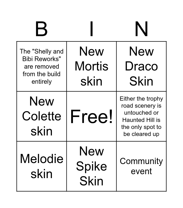 This bingo card has a free space and 8 words: Either the trophy road scenery is untouched or Haunted Hill is the only spot to be cleared up, New Draco Skin, New Mortis skin, Melodie skin, The "Shelly and Bibi Reworks" are removed from the build entirely, Community event, New Colette skin and New Spike Skin.