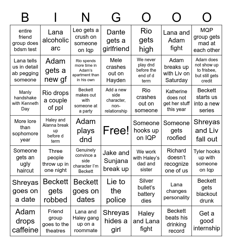 This bingo card has a free space and 49 words: Lana changes personality, Adam breaks up with Liv on Saturday, Haley and Lana fight, Haley and Alanna break up before d term, Beckett makes out with someone at a party, Shreyas and Liv fall out, Lana alcoholic arc, Lana and Haley gang up on a roommate, Lana and Adam fight, Jake and Sunjana break up, MQP group gets mad at each other, Dante gets a girlfriend, Katherine does not get her stuff this year, Rio crashes out on someone, Beckett gets robbed, Someone gets roofied, Lana tells us in detail ab pegging someone, Adam does not show up to frisbee, but still gets credit, Beckett gets blackout drunk, Rio gets high, We never play dnd before the end of d term, Adam plays dnd, entire friend group does bdsm test, Adam gets a new gf, Adam drops caffeine, Rio spends more time in Adam’s apartment than in his own, Beckett starts us into a new series, Friend group goes to the theatres, Add a new side character, non-relationship, Rio drops a couple of ppl, Haley makes an agreement to do something, pinky promises she will, and doesn’t do it, Someone hooks up on IQP, Shreyas goes on a date, Beckett goes on dates, More lore than sophomore year, We work with Haley’s dad and sister, Richard doesn’t recognize one of us, Tyler hooks up with someone on Iqp, Manly handshake with Kenneth Day, Genuinely convince a side character I’m Beckett, Lie to the police, Someone gets an ugly haircut, Get a good internship, Shreyas hides a girl, Mele crashes out on Hayden, Leo gets a crush on someone on Iqp, Silver bullet’s battery dies, Three people throw up in one night and Beckett beats his drinking record.