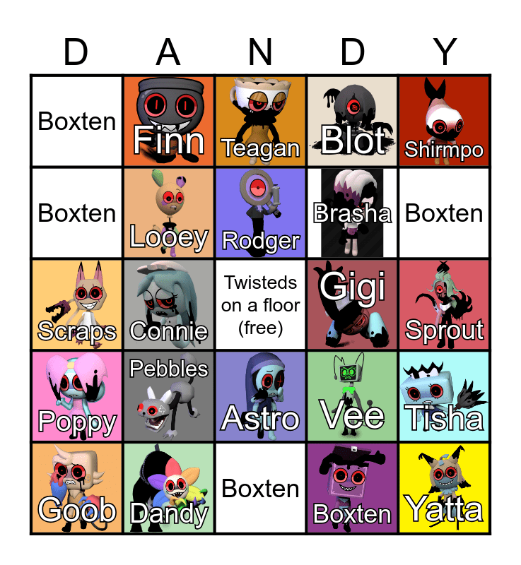 This bingo card has 27 images, a free space and 32 words: Boxten, Brightney, Connie, Cosmo, Poppy, Looey, Shirmpo, Tisha, Finn, RnD, Rodger, Teagan, Toodles, Flutter, Gigi, Glisten, Goob, Scraps, Astro, Pebbles, Vee, Shelly, Sprout, Dandy, Yatta, Blot, Brasha, Boxten, Boxten, Boxten, Boxten and Boxten.