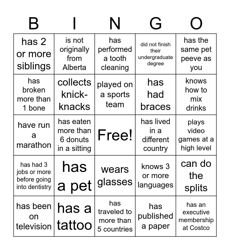 This bingo card has a free space and 25 words: has a pet, has traveled to more than 5 countries, played on a sports team, has been on television, has the same pet peeve as you, has 2 or more siblings, has broken more than 1 bone, is not originally from Alberta, has lived in a different country, wears glasses, has had braces, have run a marathon, knows 3 or more languages, can do the splits, collects knick-knacks, has gone skydiving, plays video games at a high level, has performed a tooth cleaning, knows how to mix drinks, has eaten more than 6 donuts in a sitting, has an executive membership at Costco, has a tattoo, has had 3 jobs or more before going into dentistry, did not finish their undergraduate degree and has published a paper.