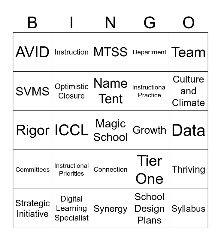 This bingo card has 63 words: Free!, Sky View, Bend La Pine, Thriving, Relationships, Relational Capacity, Instruction, PLC, Name Tent, Design, Connection, YouthTruth, Data, Team, Team Building, SVMS, ICCL, AVID, School Supplies, Instructional Practice, Instructional Priorities, Committees, Department, Thematic PLC, Students, Staff, Norms/Agreements, Support, Instructional Techniques, Stakeholder Engagement, Standards Based Grading / Instruction, Wellness, Inclusion, Belonging, Strong Academic Core, Passion Purpose Plan, Culture and Climate, Strategic Initiative, SIW, School Design Plans, Goal, Optimistic Closure, Rigor, Growth, Success, AI, Magic School, Digital Learning Specialist, Syllabus, Tier One, School Wide, Classroom Expectations, Instructional Norms, Synergy, Code of Conduct, Communication, Explicit, MTSS, Falcons, Reteach, Student Support, Staff Managed, Admin Managed, Rubric and Wayfinder.