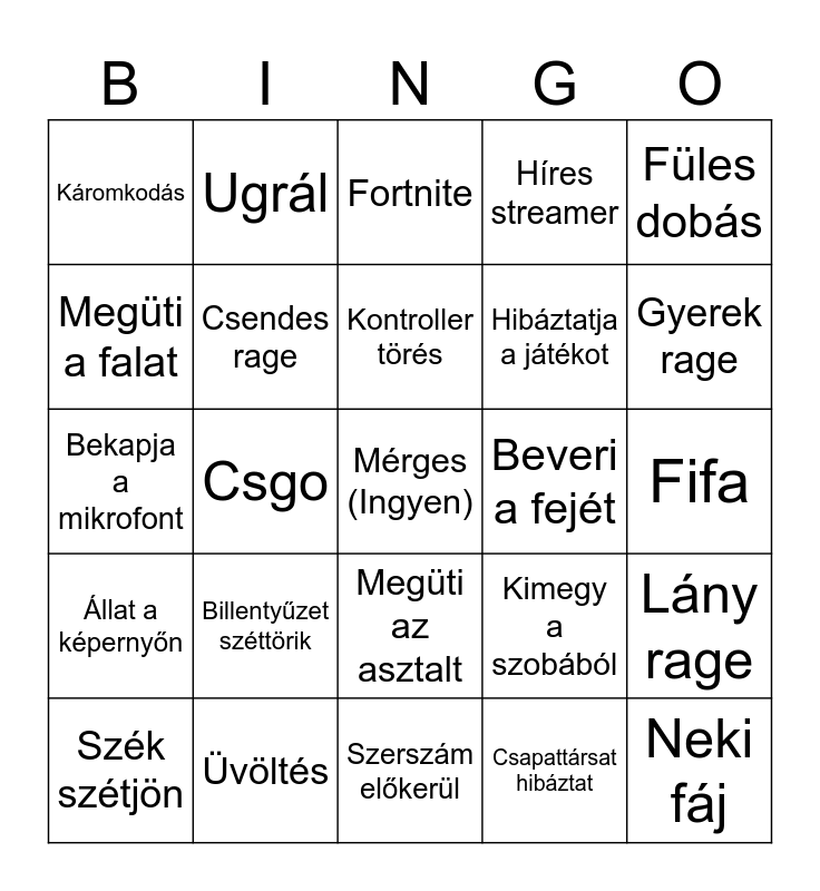 This bingo card has a free space and 24 words: Billentyűzet széttörik, Üvöltés, Kontroller törés, Szék szétjön, Füles dobás, Káromkodás, Megüti a falat, Ugrál, Beveri a fejét, Megüti az asztalt, Hibáztatja a játékot, Bekapja a mikrofont, Kimegy a szobából, Lány rage, Csendes rage, Csapattársat hibáztat, Fifa, Fortnite, Gyerek rage, Csgo, Neki fáj, Állat a képernyőn, Híres streamer and Szerszám előkerül.
