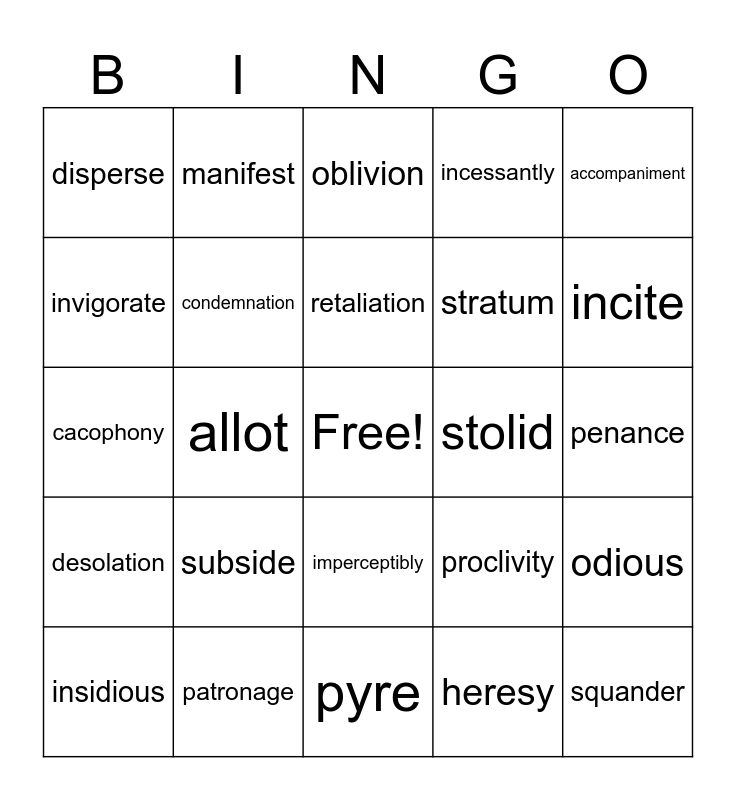 This bingo card has a free space and 24 words: subside, patronage, retaliation, insidious, accompaniment, disperse, invigorate, manifest, stolid, imperceptibly, stratum, cacophony, proclivity, odious, condemnation, heresy, penance, oblivion, incite, allot, squander, desolation, incessantly and pyre.