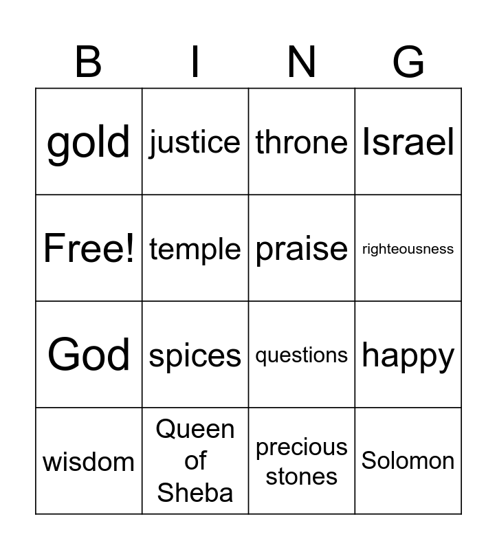 This bingo card has 16 words: Queen of Sheba, happy, throne, gold, God, justice, questions, precious stones, Free!, temple, wisdom, Israel, spices, righteousness, praise and Solomon.