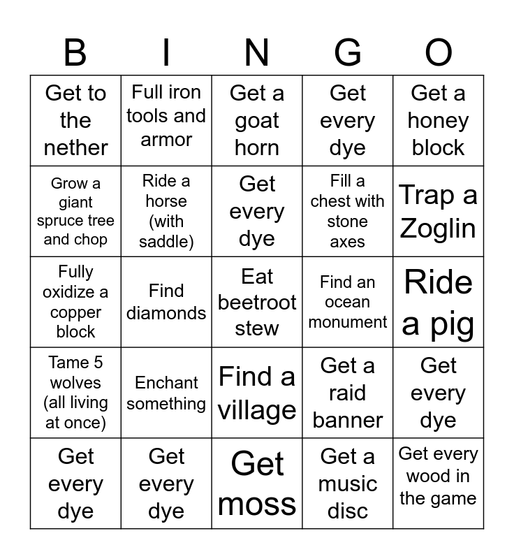 This bingo card has 30 words: Get every dye, Find 5 different biomes, Find diamonds, Make a cake, Get to the nether, Get a goat horn, Ride a horse (with saddle), Find a village, Find an ocean monument, Get moss, Ride a pig, Eat beetroot stew, Get a music disc, Get every wood in the game, Trap a Zoglin, Get a trident, Get a raid banner, Tame 5 wolves (all living at once), Enchant something, Get a honey block, Fully oxidize a copper block, Find a mineshaft, Full iron tools and armor, Fill a chest with stone axes, Grow a giant spruce tree and chop, Get every dye, Get every dye, Get every dye, Get every dye and Get every dye.
