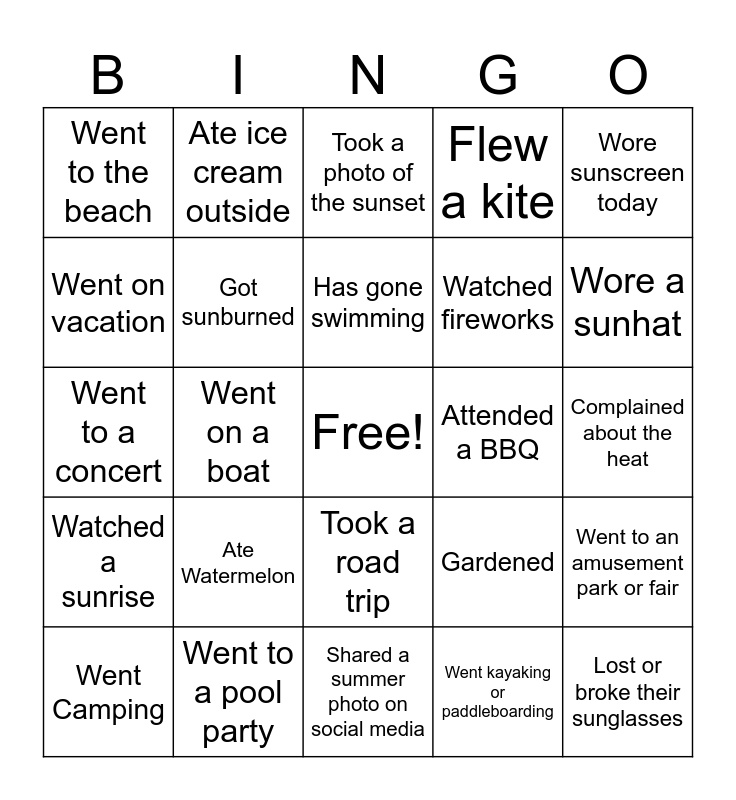 This bingo card has a free space and 24 words: Ate Watermelon, Went to a pool party, Has gone swimming, Went Camping, Wore sunscreen today, Went to the beach, Went on vacation, Ate ice cream outside, Attended a BBQ, Took a road trip, Watched fireworks, Went to a concert, Gardened, Went to an amusement park or fair, Got sunburned, Went kayaking or paddleboarding, Complained about the heat, Took a photo of the sunset, Wore a sunhat, Went on a boat, Lost or broke their sunglasses, Watched a sunrise, Flew a kite and Shared a summer photo on social media.
