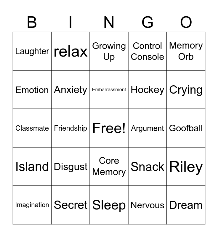 This bingo card has a free space and 38 words: Joy, Sadness, Fear, Anxiety, Riley, Disgust, Embarrassment, Nostalgia, Memory Orb, Hockey, Friendship, Control Console, Dream, Goofball, Emotion, Island, Family, Growing Up, Change, Argument, Laughter, Secret, Crying, Imagination, Best Friend, Sleep, Surprise, Teamwork, Alarm, Daydream, Memory vault, Core Memory, Nervous, relax, Giggle, Snack, Classmate and Coach.