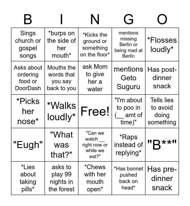 This bingo card has a free space and 24 words: "What was that?", asks to play 99 nights in the forest, ask Mom to give her a water, *Lies about taking pills*, *Flosses loudly*, Sings church or gospel songs, Asks about ordering food or DoorDash, *burps on the side of her mouth*, "I'm about to poo in (__ amt of time)", "Can we watch __ right now or while we eat?", mentions Geto Suguru, *Picks her nose*, *Raps instead of replying*, "B**", Mouths the words that you say back to you, *Has bonnet pushed back on head*, Tells lies to avoid doing something, *Kicks the ground or something on the floor*, Has post-dinner snack, *Walks loudly*, Has pre-dinner snack, "Eugh", mentions missing Berlin or being mad at Berlin and *Chews with her mouth open*.
