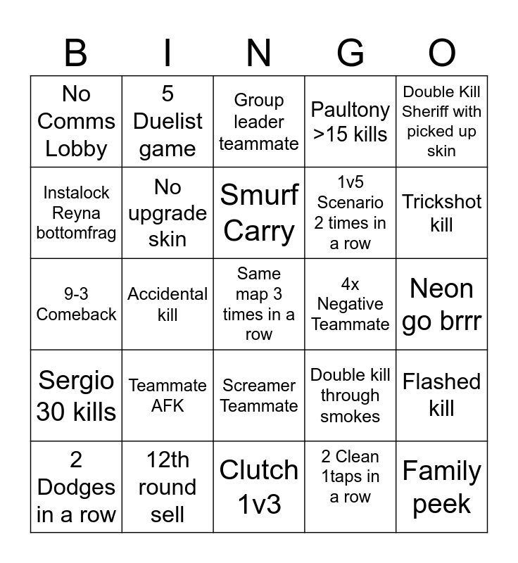 This bingo card has 25 words: Teammate AFK, Clutch 1v3, Smurf Carry, 2 Dodges in a row, Double Kill Sheriff with picked up skin, No Comms Lobby, Instalock Reyna bottomfrag, 5 Duelist game, 4x Negative Teammate, Screamer Teammate, 1v5 Scenario 2 times in a row, 9-3 Comeback, Double kill through smokes, Flashed kill, No upgrade skin, Family peek, Neon go brrr, Group leader teammate, Trickshot kill, Accidental kill, Same map 3 times in a row, 12th round sell, Sergio 30 kills, Paultony >15 kills and 2 Clean 1taps in a row.