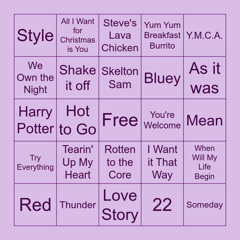 This bingo card has a free space and 44 words: Bones, Tearin' Up My Heart, Addams Family, 22, Golden, Pink Pony Club, Shake it off, APT., Yum Yum Breakfast Burrito, Someday, Style, Thunder, I Want it That Way, Mean, Happy, Soda Pop, Love Story, You're Welcome, Dark Horse, Harry Potter, All I Want for Christmas is You, Rotten to the Core, In Summer, Y.M.C.A., Let it Go, We Don't Talk About Bruno, Skelton Sam, Bye Bye Bye, When Will My Life Begin, Red, You've got a Friend in me, Steve's Lava Chicken, Mystical Magical, Thriller, Try Everything, Karma, Sweet Dreams, Everybody (Backstreet's Back), As it was, We Own the Night, Hot to Go, Party in the USA, Bluey and Defying Gravity.