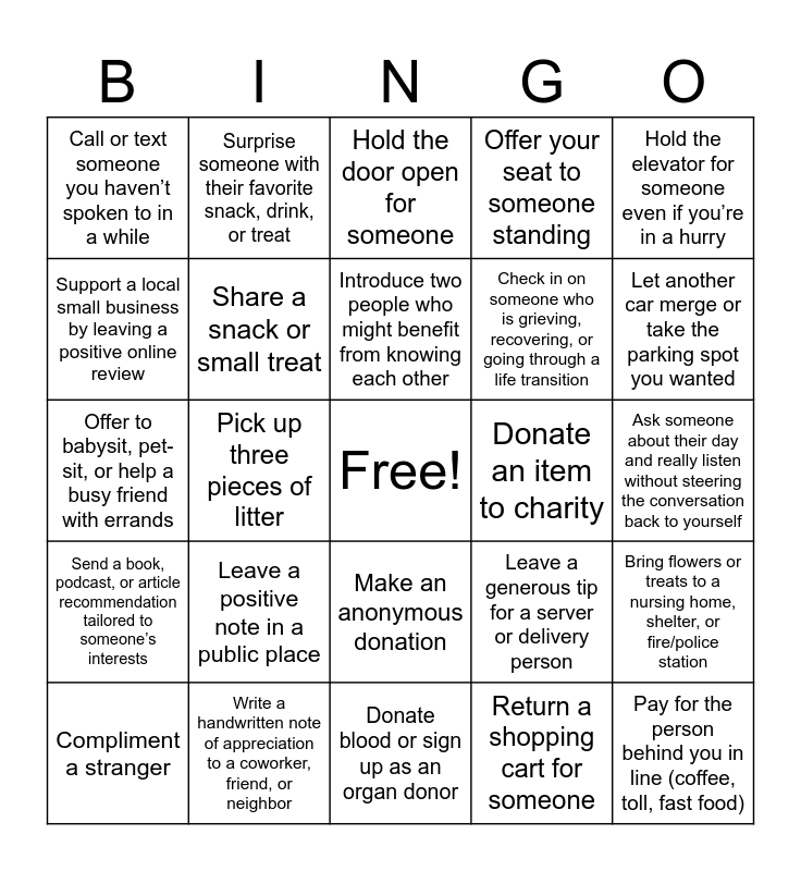 This bingo card has a free space and 29 words: Compliment a stranger, Write a thank-you note, Pick up three pieces of litter, Let someone go ahead of you in line, Call or text someone you haven’t spoken to in a while, Hold the door open for someone, Share a snack or small treat, Leave a positive note in a public place, Donate an item to charity, Write a handwritten note of appreciation to a coworker, friend, or neighbor, Ask someone about their day and really listen without steering the conversation back to yourself, Pay for the person behind you in line (coffee, toll, fast food), Donate blood or sign up as an organ donor, Return a shopping cart for someone, Let another car merge or take the parking spot you wanted, Forgive someone who wronged you (at least internally), Make an anonymous donation, Send a book, podcast, or article recommendation tailored to someone’s interests, Hold the elevator for someone even if you’re in a hurry, Offer to babysit, pet-sit, or help a busy friend with errands, Leave a generous tip for a server or delivery person, Start a gratitude text thread with friends or family, Check in on someone who is grieving, recovering, or going through a life transition, Support a local small business by leaving a positive online review, Offer your seat to someone standing, Surprise someone with their favorite snack, drink, or treat, Bring flowers or treats to a nursing home, shelter, or fire/police station, Introduce two people who might benefit from knowing each other and Carry someone’s groceries or heavy bag.