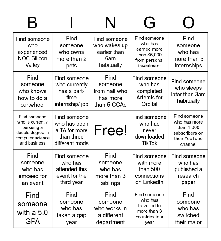 This bingo card has a free space and 25 words: Find someone who has attended this event for the third year, Find someone who works in a different department, Find someone from hall who has more than 5 CCAs, Find someone with a 5.0 GPA, Find someone who has more than 5 internships, Find someone who experienced NOC Silicon Valley, Find someone who knows how to do a cartwheel, Find someone who owns more than 2 pets, Find someone who has never downloaded TikTok, Find someone who has more than 3 siblings, Find someone who has completed Artemis for Orbital, Find someone who is currently pursuing a double degree in computer science and business, Find someone with more than 500 connections on LinkedIn, Find someone who has published a research paper, Find someone who currently has a part-time internship/ job, Find someone who has won a hackathon, Find someone who has more than 1,000 subscribers on their YouTube channel, Find someone who wakes up earlier than 6am habitually, Find someone who sleeps later than 3am habitually, Find someone who has been a TA for more than three different mods, Find someone who has switched their major, Find someone who has taken a gap year, Find someone who has emceed for an event, Find someone who has earned more than $5,000 from personal investment and Find someone who has travelled to more than 3 countries in a year.