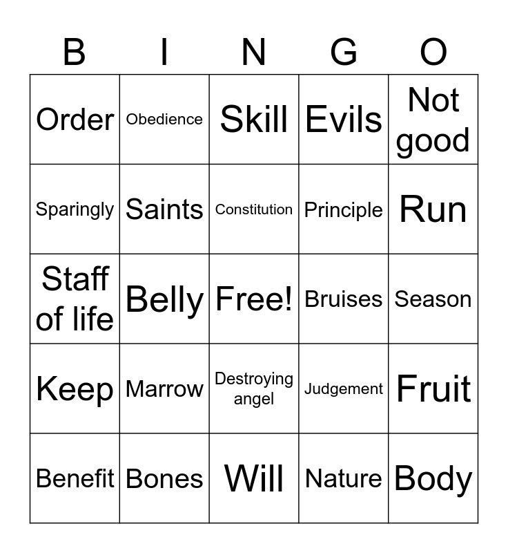 This bingo card has a free space and 55 words: Word of Wisdom, Benefit, Revelation, Order, Will, Temporal salvation, Saints, Last days, Principle, Promise, Evils, Designs, Conspiring men, Warned, Wine, Strong drink, Not good, Belly, Tobacco, Body, Bruises, Sick cattle, Judgement, Skill, Wholesome herbs, Constitution, Nature, Use, Season, Fruit, Prudence, Thanksgiving, Flesh of beasts (meat), Fowls, Sparingly, Staff of life, Wheat, Keep, Do, Walking, Obedience, Commandments, Health, Navel, Marrow, Bones, Treasures, Knowledge, Hidden treasures, Run, Weary, Walk, Faint, Destroying angel and Pass by.