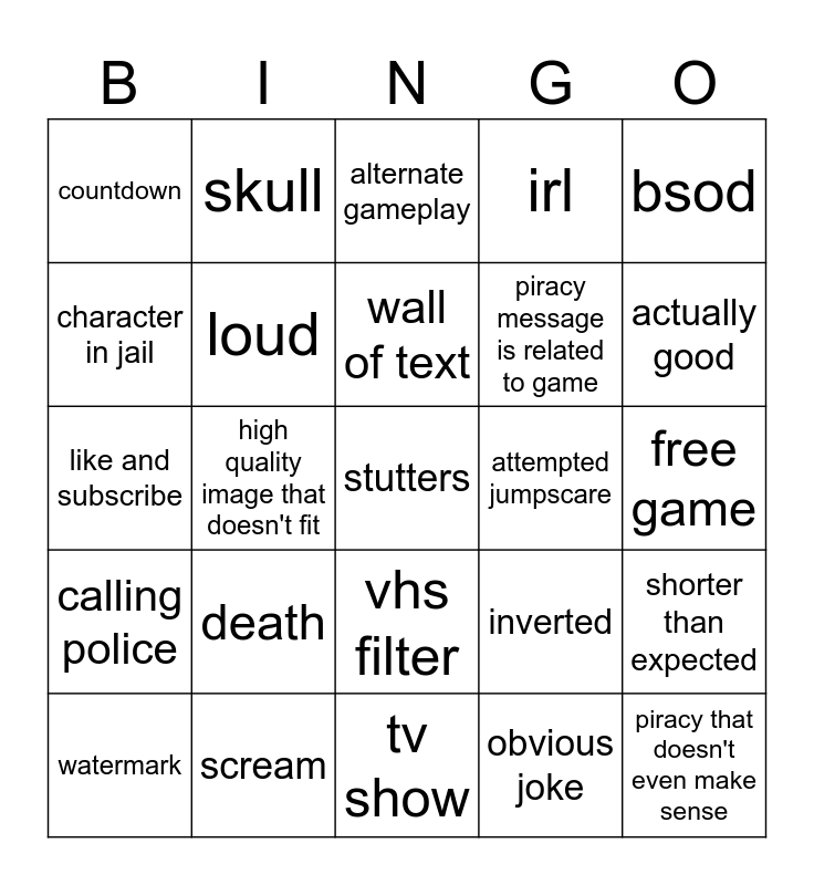 This bingo card has a free space and 39 words: japanese text, scary eyes, 2 different screens, loud, watermark, vhs filter, wall of text, "why are you still here", bsod, calling police, high quality image that doesn't fit, irl, piracy that doesn't even make sense, free game, attempted jumpscare, death, phone number, countdown, red tint, inverted, character in jail, tv show, piracy message is related to game, actually good, overload, console message, character talking to player, fine amount, turn off ____, skull, wii crash sound, recognizable sfx, alternate gameplay, scream, obvious joke, lasts way too long, shorter than expected, like and subscribe and text to speech.