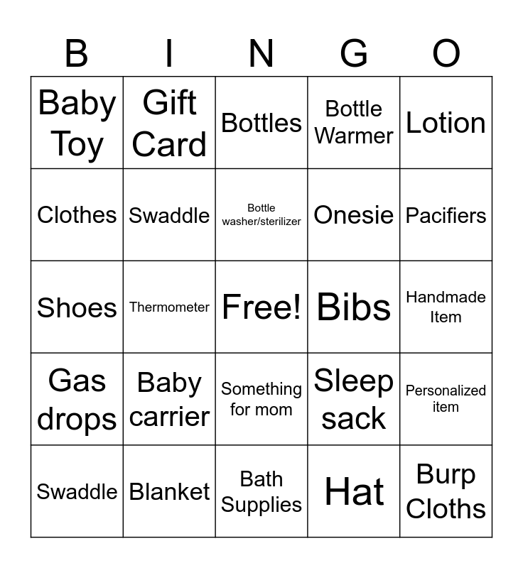 This bingo card has a free space and 44 words: Stuffed Animal, Burp Cloths, Baby Hairbrush, Swaddle, Socks, Hat, Bottles, Soap, Lotion, Blanket, Bottle Warmer, Bibs, Something for mom, Baby carrier, Monitor, Bath Supplies, Bottles, Shoes, Swaddle, Pacifiers, Gift Card, Mittens, Teether, Baby Toy, Onesie, Handmade Item, Decor, Diaper Bag, Sleep sack, Gas drops, Complete outfit, Personalized item, Humidifier, Bowls or plates, Thermometer, Medicine, Baby food, Nail clippers, Bottle washer/sterilizer, Clothes, Onesie, First aid, Swaddle and Burp cloths.