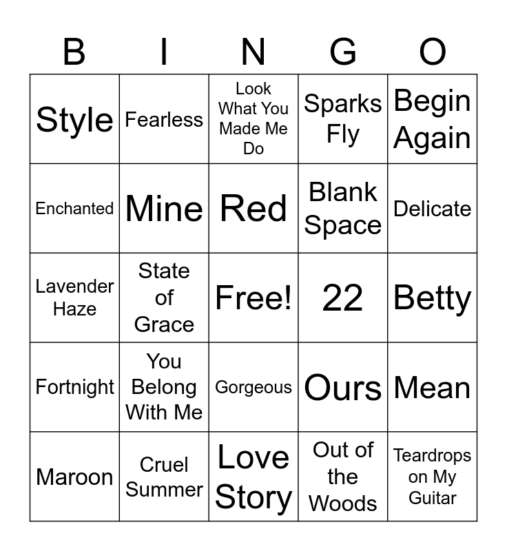 This bingo card has a free space and 50 words: Tim McGraw, Teardrops on My Guitar, Our Song, Love Story, You Belong With Me, Fifteen, Fearless, The Best Day, Enchanted, Back to December, Mine, Sparks Fly, Mean, Ours, Long Live, All Too Well, Red, 22, We Are Never Ever Getting Back Together, Begin Again, State of Grace, Out of the Woods, Style, Blank Space, Wildest Dreams, New Romantics, Delicate, Getaway Car, Look What You Made Me Do, Gorgeous, Lover, The Archer, The Man, Death by a Thousand Cuts, Cruel Summer, The Last Great American Dynasty, Exile, Cardigan, August, Betty, Champagne Problems, No Body, No Crime, Willow, Anti-Hero, Maroon, Lavender Haze, Karma, You’re On Your Own, Kid, Fortnight and Down Bad.