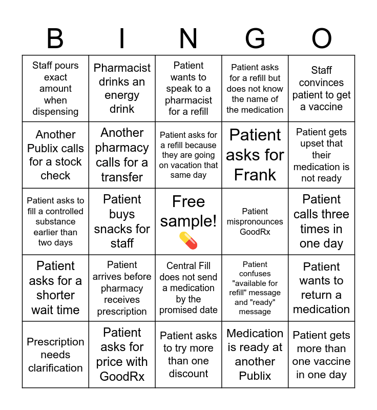 This bingo card has a free space and 24 words: Patient arrives before pharmacy receives prescription, Patient asks for price with GoodRx, Patient asks for a refill because they are going on vacation that same day, Prescription needs clarification, Staff convinces patient to get a vaccine, Staff pours exact amount when dispensing, Another Publix calls for a stock check, Pharmacist drinks an energy drink, Patient mispronounces GoodRx, Central Fill does not send a medication by the promised date, Patient asks for Frank, Patient asks to fill a controlled substance earlier than two days, Patient confuses "available for refill" message and "ready" message, Patient wants to return a medication, Another pharmacy calls for a transfer, Medication is ready at another Publix, Patient calls three times in one day, Patient wants to speak to a pharmacist for a refill, Patient gets upset that their medication is not ready, Patient buys snacks for staff, Patient gets more than one vaccine in one day, Patient asks for a shorter wait time, Patient asks for a refill but does not know the name of the medication and Patient asks to try more than one discount.