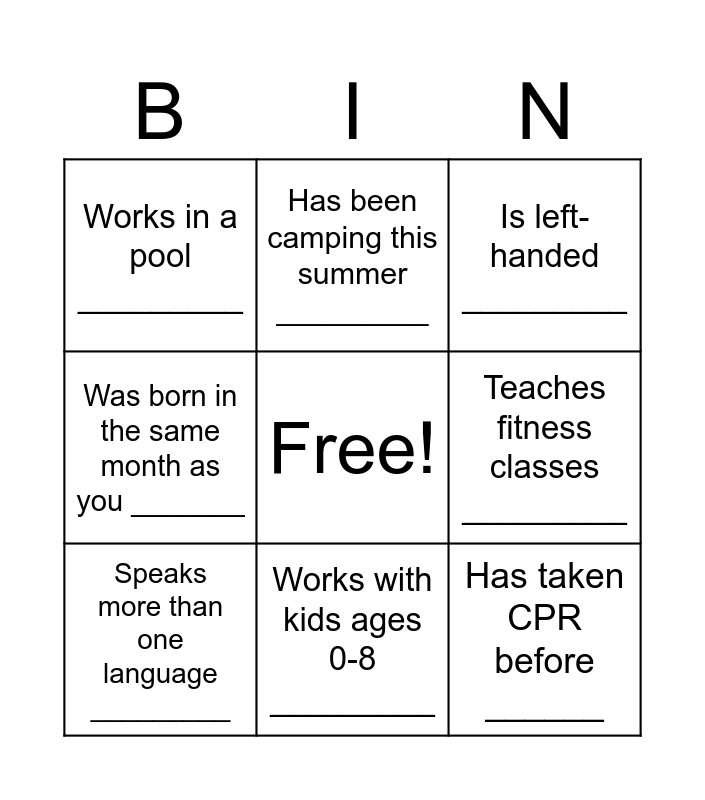 This bingo card has a free space and 8 words: Teaches fitness classes _________, Is left-handed _________, Has been camping this summer _________, Speaks more than one language _________, Works in a pool _________, Has taken CPR before ______, Was born in the same month as you _______ and Works with kids ages 0-8 _________.