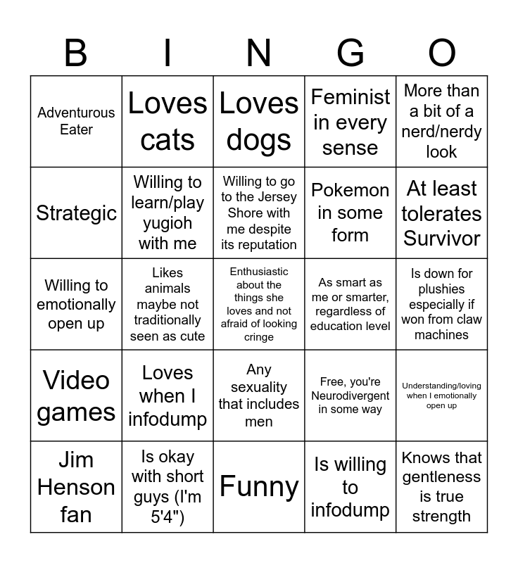 This bingo card has 25 words: Loves when I infodump, Funny, Willing to go to the Jersey Shore with me despite its reputation, Jim Henson fan, More than a bit of a nerd/nerdy look, Adventurous Eater, Strategic, Loves cats, As smart as me or smarter, regardless of education level, Any sexuality that includes men, Pokemon in some form, Willing to emotionally open up, Free, you're Neurodivergent in some way, Understanding/loving when I emotionally open up, Willing to learn/play yugioh with me, Knows that gentleness is true strength, Is down for plushies especially if won from claw machines, Loves dogs, At least tolerates Survivor, Likes animals maybe not traditionally seen as cute, Enthusiastic about the things she loves and not afraid of looking cringe, Is okay with short guys (I'm 5'4"), Video games, Feminist in every sense and Is willing to infodump.