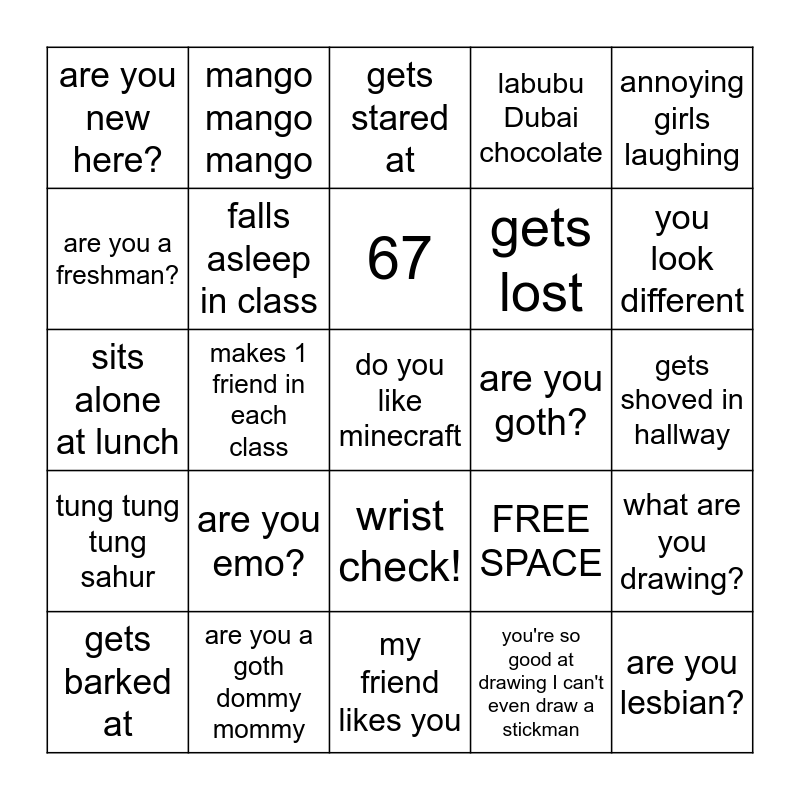 This bingo card has 25 words: are you emo?, my friend likes you, 67, gets barked at, annoying girls laughing, are you new here?, are you a freshman?, mango mango mango, are you goth?, wrist check!, gets lost, sits alone at lunch, FREE SPACE, what are you drawing?, falls asleep in class, are you lesbian?, gets shoved in hallway, gets stared at, you look different, makes 1 friend in each class, do you like minecraft, are you a goth dommy mommy, tung tung tung sahur, labubu Dubai chocolate and you're so good at drawing I can't even draw a stickman.