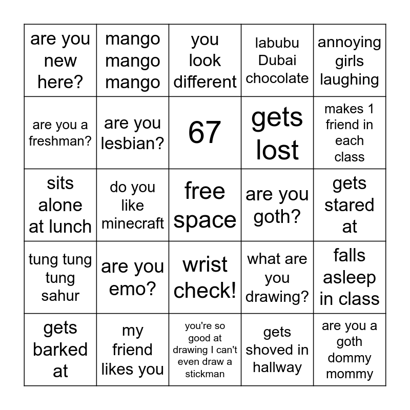 This bingo card has a free space and 24 words: are you emo?, my friend likes you, 67, gets barked at, annoying girls laughing, are you new here?, are you a freshman?, mango mango mango, are you goth?, wrist check!, gets lost, sits alone at lunch, what are you drawing?, falls asleep in class, are you lesbian?, gets shoved in hallway, gets stared at, you look different, makes 1 friend in each class, do you like minecraft, are you a goth dommy mommy, tung tung tung sahur, labubu Dubai chocolate and you're so good at drawing I can't even draw a stickman.