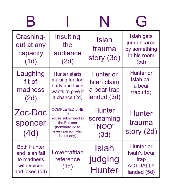 This bingo card has 16 words: Lovecraftian reference (1d), Hunter trauma story (2d), Isiah trauma story (3d), Crashing-out at any capacity (1d), Zoc-Doc sponcer (4d), Insulting the audience (2d), Hunter screaming "NOO" (3d), Isiah judging Hunter, Laughing fit of madness (2d), Hunter starts making fun too early and Isiah wants to give it a chance (2d), Both Hunter and Isiah fall to madness with voices and jokes (5d), Isiah gets jump scared by something in his room (5d), COMPLETED LINE ^> You're subscribed to the Patreon (nominate 3d to every person who isn't if any), Hunter or Isiah call a bear trap (1d), Hunter or Isiah claim a bear trap landed (3d) and Hunter or Isiah's bear trap ACTUALLY landed (5d).