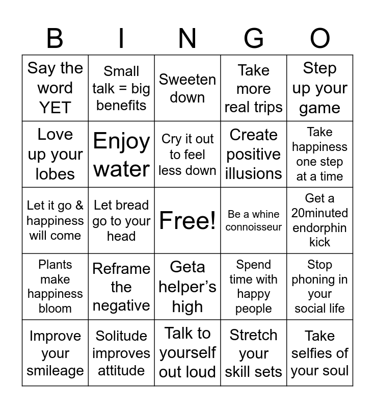 This bingo card has a free space and 25 words: Reframe the negative, Talk to yourself out loud, Cry it out to feel less down, Improve your smileage, Step up your game, Say the word YET, Love up your lobes, Small talk = big benefits, Be a whine connoisseur, Geta helper’s high, Create positive illusions, Let it go & happiness will come, Spend time with happy people, Stop phoning in your social life, Enjoy water, Devour good mood food, Get a 20minuted endorphin kick, Sweeten down, Take happiness one step at a time, Let bread go to your head, Take selfies of your soul, Solitude improves attitude, Plants make happiness bloom, Take more real trips and Stretch your skill sets.