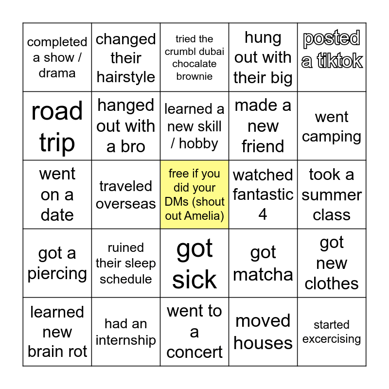 This bingo card has a free space and 24 words: ruined their sleep schedule, had an internship, learned a new skill / hobby, learned new brain rot, posted a tiktok, completed a show / drama, road trip, changed their hairstyle, watched fantastic 4, got sick, made a new friend, went on a date, got matcha, got new clothes, hanged out with a bro, moved houses, took a summer class, tried the crumbl dubai chocalate brownie, went camping, traveled overseas, started excercising, got a piercing, hung out with their big and went to a concert.