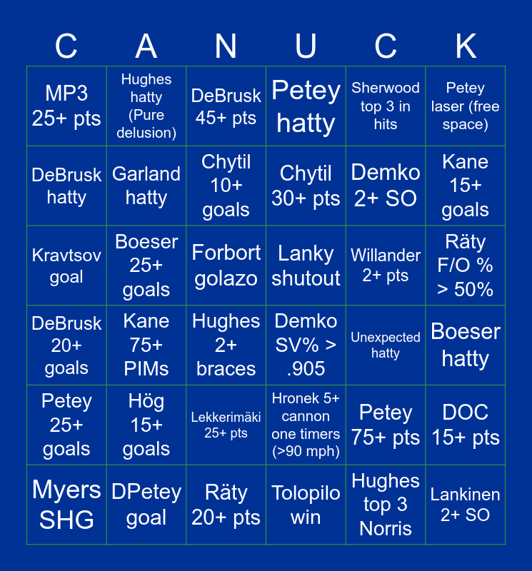 This bingo card has 37 words: Petey 75+ pts, Hronek 5+ cannon one timers (>90 mph), Hughes top 3 Norris, DeBrusk hatty, Kane 75+ PIMs, Willander 2+ pts, Garland hatty, Tolopilo win, Sherwood top 3 in hits, Myers SHG, Kane 15+ goals, Petey hatty, Kravtsov goal, Forbort golazo, Petey laser (free space), Lanky shutout, Hög 15+ goals, DeBrusk 45+ pts, Räty F/O % > 50%, Boeser 25+ goals, MP3 25+ pts, Chytil 30+ pts, Hughes 2+ braces, Unexpected hatty, DPetey goal, Boeser hatty, Hughes hatty (Pure delusion), Räty 20+ pts, DOC 15+ pts, Lekkerimäki 25+ pts, Hughes 50+ assists, Demko SV% > .905, Demko 2+ SO, Petey 25+ goals, DeBrusk 20+ goals, Chytil 10+ goals and Lankinen 2+ SO.