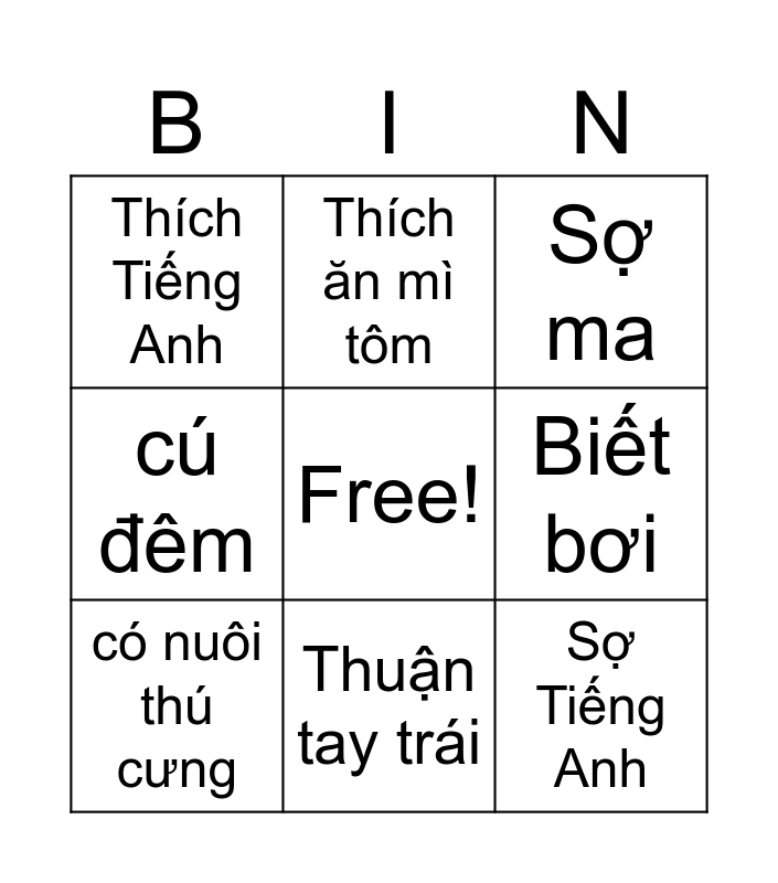 This bingo card has a free space and 8 words: Biết bơi, Sợ ma, Thích ăn mì tôm, có nuôi thú cưng, Thích Tiếng Anh, Sợ Tiếng Anh, cú đêm and Thuận tay trái.