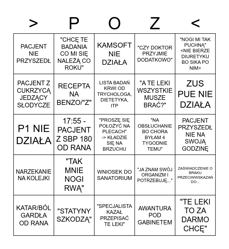This bingo card has 25 words: "TAK MNIE NOGI RWĄ", "SPECJALISTA KAZAŁ PRZEPISAĆ TE LEKI", LISTA BADAŃ KRWI OD TRYCHOLOGA, DIETETYKA, ITP, KATAR/BÓL GARDŁA OD RANA, "NOGI MI TAK PUCHNĄ" <NIE BIERZE DIURETYKU BO SIKA PO NIM>, PACJENT NIE PRZYSZEDŁ, PACJENT Z CUKRZYCĄ JEDZĄCY SŁODYCZE, "CHCĘ TE BADANIA CO MI SIĘ NALEŻĄ CO ROKU", "NA OBSŁUCHANIE BO CHORA BYŁAM 4 TYGODNIE TEMU", WNIOSEK DO SANATORIUM, "A TE LEKI WSZYSTKIE MUSZE BRAĆ?", P1 NIE DZIAŁA, "JA ZNAM SWÓJ ORGANIZM I POTRZEBUJĘ...", ZAŚWIADCZENIE O BRAKU PRZECIWWSKAZAŃ DO..., RECEPTA NA BENZO/"Z", "TE LEKI TO ZA DARMO CHCĘ", PACJENT PRZYSZEDŁ NIE NA SWOJĄ GODZINĘ, KAMSOFT NIE DZIAŁA, ZUS PUE NIE DZIAŁA, 17:55 - PACJENT Z SBP 180 OD RANA, "PROSZĘ SIĘ POŁOŻYĆ NA PLECACH" -> KŁADZIE SIĘ NA BRZUCHU, "STATYNY SZKODZĄ", NARZEKANIE NA KOLEJKI, "CZY DOKTOR PRZYJMIE DODATKOWO" and AWANTURA POD GABINETEM.
