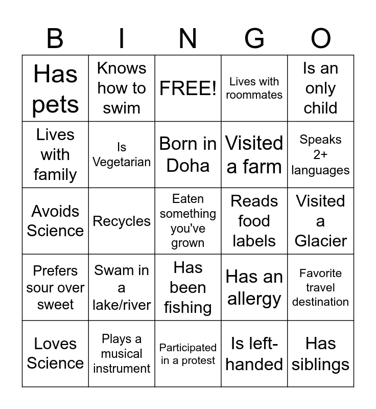 This bingo card has a free space and 29 words: Loves Science, Takes public transport, Recycles, Visited a National Park, Has pets, FREE!, Is Vegetarian, Swam in a lake/river, Reads food labels, Plays a musical instrument, Visited a Glacier, Has siblings, Participated in a protest, Is left-handed, Speaks 2+ languages, Has been camping, Has been fishing, Prefers sour over sweet, Is an only child, Avoids Science, Has an allergy, Plays a sport, Visited a farm, Lives with family, Lives with roommates, Knows how to swim, Favorite travel destination, Born in Doha and Weirdest thing you've eaten.