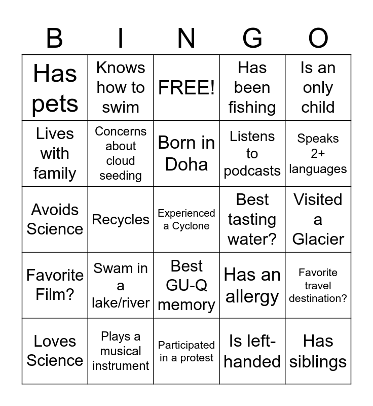 This bingo card has a free space and 29 words: Loves Science, Takes public transport, Recycles, Visited a National Park, Has pets, FREE!, Concerns about cloud seeding, Swam in a lake/river, Best tasting water?, Plays a musical instrument, Visited a Glacier, Has siblings, Participated in a protest, Is left-handed, Speaks 2+ languages, Has been camping, Best GU-Q memory, Favorite Film?, Is an only child, Avoids Science, Has an allergy, Plays a sport, Listens to podcasts, Lives with family, Has been fishing, Knows how to swim, Favorite travel destination?, Born in Doha and Weirdest thing you've eaten?.