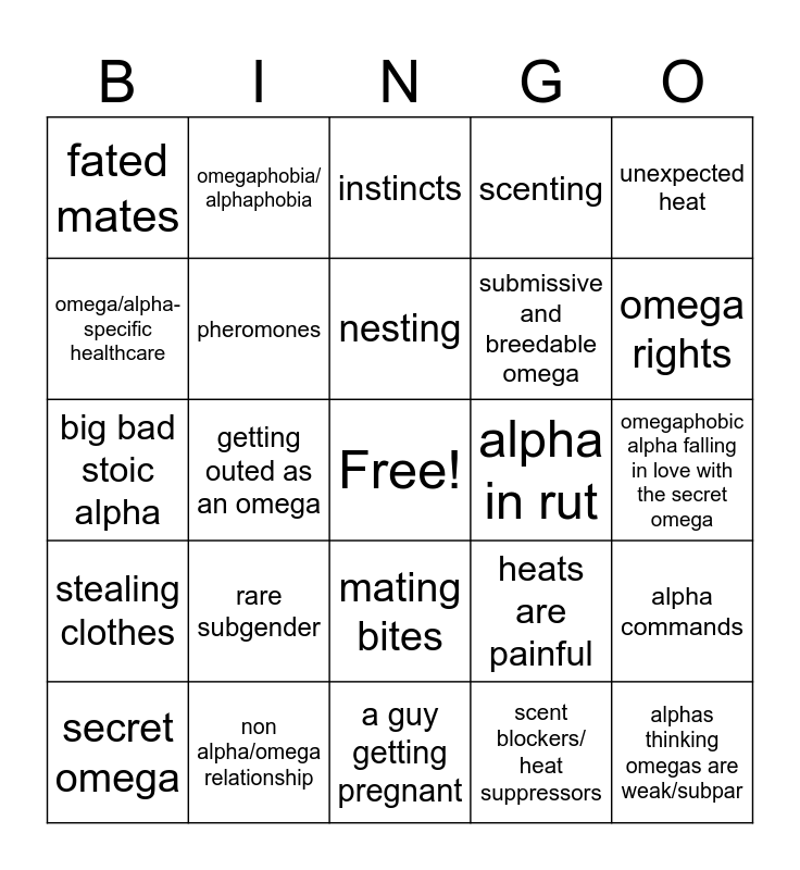 This bingo card has a free space and 24 words: rare subgender, non alpha/omega relationship, nesting, secret omega, unexpected heat, fated mates, omega/alpha-specific healthcare, omegaphobia/ alphaphobia, alpha in rut, mating bites, submissive and breedable omega, big bad stoic alpha, heats are painful, alpha commands, pheromones, scent blockers/ heat suppressors, omegaphobic alpha falling in love with the secret omega, instincts, omega rights, getting outed as an omega, alphas thinking omegas are weak/subpar, stealing clothes, scenting and a guy getting pregnant.