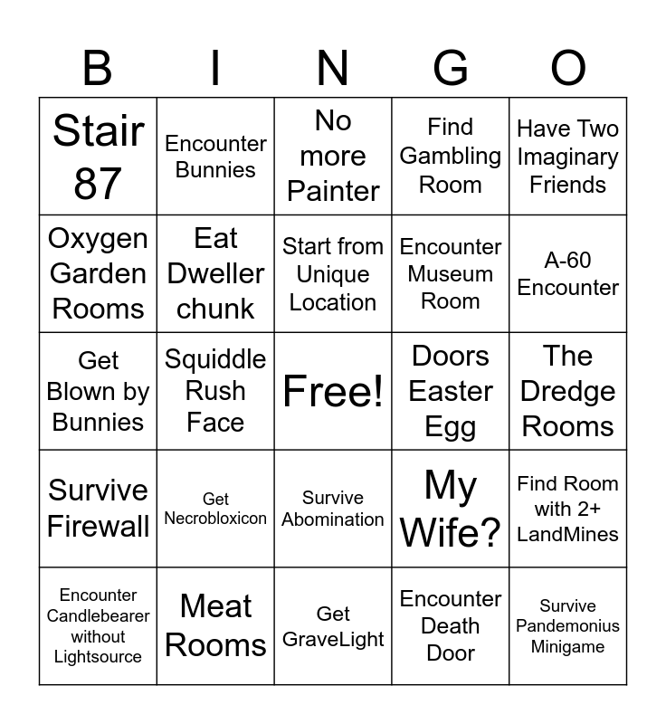 This bingo card has a free space and 49 words: Reddy and Red Ball Room, Survive Pandemonius Minigame, Die to Mr. Loppy, Get GraveLight, Get Necrobloxicon, Open Lotus Room, Encounter Bunnies, Green Code Room, Oxygen Garden Rooms, Survive Beatdown from Divine, Eat Dweller chunk, Find Gambling Room, Find Room with 2+ LandMines, My Wife?, Church Puppets Door, Encounter 3+ Colors of VoidMass in a RUN, Start from Unique Location, Doors Easter Egg, Exotic Butter, Have Two Imaginary Friends, Squiddle Rush Face, Encounter Death Door, Stair 87, Encounter Museum Room, Get into Chainsmokers Domain, A-60 Encounter, Encounter Candlebearer without Lightsource, Abstract Art, Survive Abomination, Survive Firewall, Survive SearchLight, Win the Game without Revives, Get Killed by Sebastian, Enrage Eyefestation to Purple Phase, Meat Rooms, Server Farms, Funny Chest, River Rooms, The Dredge Rooms, Lockerless?, Encounter CandleBrute, Get to Crystal within 35 minutes, Not lose HP in ANY Encounter, Recover HP 5 times in a RUN, Get Blown by Bunnies, No more Painter, Encouter Same Easter Egg 3+ Times in a RUN, NAVI AI Room and Are we in a LOOP? (Reach Room 150 in Endless).
