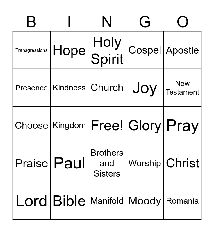 This bingo card has a free space and 24 words: Paul, Bible, Church, Lord, Apostle, Transgressions, Presence, Hope, Glory, Brothers and Sisters, Joy, Choose, Worship, Christ, Kindness, Moody, Pray, Holy Spirit, New Testament, Kingdom, Romania, Praise, Gospel and Manifold.