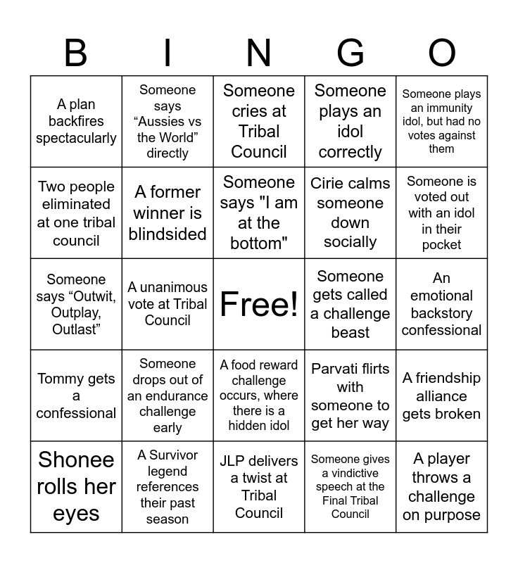 This bingo card has a free space and 36 words: Someone fakes an immunity idol, Fire-making tie-breaker at Tribal Council, Immunity challenge that goes for over an hour, A former winner is blindsided, Parvati flirts with someone to get her way, Tommy gets a confessional, Someone says "I am at the bottom", Someone plays an immunity idol for someone else, Someone plays an immunity idol, but had no votes against them, A hidden immunity idol is found, A unanimous vote at Tribal Council, Someone plays an idol correctly, Survivor Auction challenge occurs, Someone gets called a challenge beast, Someone is voted out with an idol in their pocket, A plan backfires spectacularly, Challenge ends in a photo finish, Someone drops out of an endurance challenge early, A player throws a challenge on purpose, Someone cries at Tribal Council, An emotional backstory confessional, A friendship alliance gets broken, A Survivor legend references their past season, Shonee rolls her eyes, JLP delivers a twist at Tribal Council, Someone says “Aussies vs the World” directly, Someone says “Outwit, Outplay, Outlast”, A player builds a spy shack or something sneaky, Cirie calms someone down socially, Two people eliminated at one tribal council, Kirby gets voted out, Parvati is voted out, Someone gives a vindictive speech at the Final Tribal Council, A food reward challenge occurs, where there is a hidden idol, A player wins more than three individual immunity challenges and Someone mentions their family back home in a confessional.