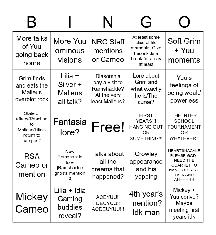 This bingo card has a free space and 24 words: New Ramshackle lore [Ramshackle ghosts mention :0], Lilia + Idia Gaming buddies reveal?, Diasomnia pay a visit to Ramshackle? At the very least Malleus?, Mickey Cameo, Soft Grim + Yuu moments, More talks of Yuu going back home, Grim finds and eats the Malleus overblot rock, More Yuu ominous visions, FIRST YEARS!!! HANGING OUT OR SOMETHING!!!, Talks about all the dreams that happened?, Lore about Grim and what exactly he is/The curse?, State of affairs/Reaction to Malleus/Lilia's return to campus?, Crowley appearance and his yapping, HEARTSHACKLE PLEASE GOD I NEED THE QUARTET TO HANG OUT AND TALK AND AHHHHHH, Lilia + Silver + Malleus all talk?, 4th year's mention? Idk man, THE INTER SCHOOL TOURNAMENT OR WHATEVER!!, NRC Staff mentions or Cameo, Yuu's feelings of being weak/ powerless, Fantasia lore?, Mickey + Yuu convo? Maybe meeting first years idk, RSA Cameo or mention, At least some slice of life moments, Give these kids a break for a day at least and ACEYUU!! DEUYUU!! ACDEUYUU!!!.