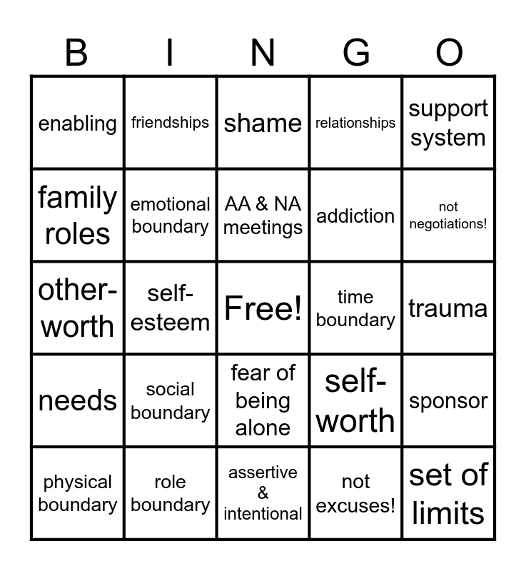 This bingo card has a free space and 29 words: physical boundary, codependent, self-esteem, self-care, enabling, shame, emotional boundary, social boundary, time boundary, role boundary, trauma, set of limits, assertive & intentional, not excuses!, not negotiations!, fear of rejection, fear of being alone, needs, support system, other- worth, self-worth, self-respect, addiction, family roles, relationships, friendships, sponsor, AA & NA meetings and schedules & routines.